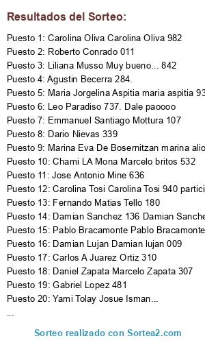 Lista de participantes: Emmanuel Santiago Mottura 107, Lucas Carballo Sin dudas el mejor lugar!, German Pichon Camino muy bueno 474, Noemi Maz Lorena Noemi 292, Lelu Rodriguez Daniela Rodriguez 498, Paulinho Dini Pablo Dini 041, Alejandro Vivas Alejandro Vivas 305, Beto Oropel Alberto Oropel 578, Lucas Carballo Por la colita cromada 056, Gustavo Norberto Castro dni720, Lu Leguizamon Luciana 476, Ramiro Monforte Ramiro monforte 829, Chami LA Mona Marcelo britos 532, Yami Tolay Yamila Tolay 944 .., Karina Andrea Nieto karina andrea nieto 431, Elias Diaz Elias Diaz 061..., Federico Scruzzo federico scruzzo 154, Noemi Lopez Angélica Noemi Lopez 703, Diego A. Raimondi diego 273, Mariela Juarez Mariela Juarez ,965, Mary Sol Sole 520, Marina Eva De Bosernitzan marina alioni 613, Daiana Mieres Marina Mieres 228, Elnegrito Caceres 742 alan caceres, Fernando Daniel Liquin Excelente. 591, Paula QF Paula quiroga 361, Antonio Gris Lobo 383 espectaculares regalos!, Leo Paradiso 737. Dale paoooo, Gustavo Paredes Gustavo Sacabollos 613, Pablo Bracamonte Pablo Bracamonte 890, PaBlo Eesequieel Cab Pablo Suarez 019, Lau Cha Diego martin 782, Ariel Moreno Ariel Moreno 601i, Javier Zamboni Javier Zamboni 893, Ezequiel Nuñez Nueñez ezequiel 004, Agus Boaglio Agustina Boaglio 458, Rodrigo Zapata Rodrigo zapata 647, Adriana Gomez Genios... ojalá gane... 614, Gabriel Ruiz Gabrielruiz 340, Agus Cuevas Qué bueno! Agustina Cuevas 943, Natalia Riboldazzi 398, Lucas Maidana 708, Lidia Teresa Rodriguez 970, Agustin Becerra 284., Ariel Camaño 568, Marcela Alejandra Murua marcela murua 645, Damian Sanchez 136, Ariel G Barrera 234, Memy JuncOs 980, Oscar Eusebi 634, Fabri Rubotti 533, Pablo Avellaneda 125, Jose Antonio Mine 636, Pablo Martin Medrano 609, Fabrizio Lopez 902, Leonardo Gómez 367, Pablo Andres Borghi 183, Gabriel Lopez 481, Diego Nicolas Villa Diego NicolasVilla798, Desireè Nieto 280, Elizabeth Alejandra Elizabeth Alejandra Cartes 971, Yami Tolay Josue Isman..., Damian Sanchez 136 Damian Sanchez, Ruben Hector Oliva Ruben Hector Oliva 308, Carolina Oliva Carolina Oliva 982, Maximiliano Valenti Maximiliano Valenti 784, Oscar Eduardo Caceres Oscar Eduardo Caceres 073, Carolina Tosi Carolina Tosi 940 participó! !, Fabian Romero Fabian 568, Monica Muchut Monica muchut 028, Daniel Zapata Marcelo Zapata 307, Cristian Pedraza Cristian 194, Cesar Chechuga Tarrab, Daniel Alberto Cocconi Daniel Cocconi 626, Gerardo Rocca Gerardo Rocca 498, Claudia Guzman Claudia guzman 588, Lorena Milesi 146, Emilio Dryon 853, Susana Oviedo 099, Erica Marcel 943, Pablo Bonetto 943, Roberto Conrado 011, Mariano Gimenez 019, Nahuel Otero 618, Marce Gomez Ilchajas 421, Diego Valdez 515, David Carrizo 769, Lucas Trivini 378, Mono Bulacio 194, Valeria Saavedra 606, Alaan Pedraza 545, Tania Gonzalez 229, Jose Luis Rodriguez 488, Maria Moreyra 022, Noelia Solian Me encanta... !! 461, Hector Ricardo Galarza me gusta! 834, Lorenzo Alabarce Alabarce Lorenzo 144 😎, Liliana Musso Muy bueno... 842, Josue Vera 445, Fernando Merino 867, Mario Oscar Lopez 828, Lukas Luttri 000, Maxi Rodriguez 381, Marisa Andrea Lescano 107, Gustavo Oviedo Gustavo Oviedo 258, Cynthia Garrido Cynthia Garrido 507, ulian Sanchez 178, Carlos A Juarez Ortiz 310, Sergio Portillo Colonia Caroya 736, Sebastian Cortez mi tres ultimos son n265, Lucas Dalpino 267, Fernando Matias Tello 180, Ggc Ggc Asociados 506, Dario Nievas 339, Natalia Diaz 211, Juan Carlos Perez Juan Carlos perez 057, Alejandro Vivas Alejandro vivas 305, Maria Fernanda Funes Velez 063, Luis Menceguez Menceguez luis 194, Marcelo Andrada Marcelo Andrada 569, Andrea Bertone Andrea Rodriguez 945, Maria Jorgelina Aspitia maria aspitia 932, Jose Luis Allen Allen jose luis 378, Damian Lujan Damian lujan 009, Roberto Palacio 792, Juan Manuel Valdez 069, Gabriel Subirats 135, Ramon Bustos 965, Pablo Alejandro Acuña 780, Hector Alejandro Castro 973, Cuchillo Franco Almada 741, Adriana Ligorria 878, Marcos Heredia 202, Walter Merlo 077, Exe Calderon 212, Condora Aguirre 789, Javier Javier 677, Juan Gabriel Segovia 048, Rodrigo Galleguillo 209, Fernando Ibarra 979, Chez Chezarelli 946.