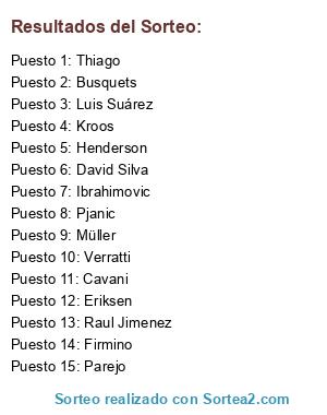 Lista de participantes: Busquets, David Silva, Luis Suárez, Kroos, Verratti, Müller, Henderson, Firmino, Thiago, Parejo, Pjanic, Raul Jimenez, Eriksen, Cavani, Ibrahimovic.
