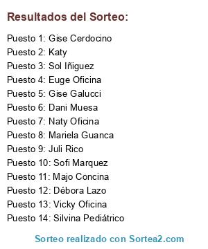 Lista de participantes: Mariela Guanca(2 participaciones), Dani Muesa(3 participaciones), Gise Galucci(2 participaciones), Sol Iñiguez(2 participaciones), Gise Cerdocino(2 participaciones), Katy, Juli Rico, Naty Oficina(2 participaciones), Sofi Marquez, Débora Lazo(2 participaciones), Euge Oficina(2 participaciones), Vicky Oficina, Majo Concina, Silvina Pediátrico(2 participaciones).
