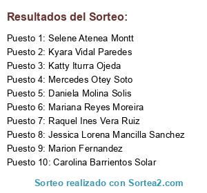 Lista de participantes: Aarona Armario, Adela Alejandra González Alvarez, Adriana Maribel Auladell Rojas, Adriana Vera Vera, Aerdna Odañam, Aguila Ag Daniela, Aileen Stephania, Alejandra Suarez Rioseco, Alex Hernandez Cabello, Alicia Barria(2), Alvaro Valdebenito, Ámbar Alvarado, Ana L Mendez, Ana Luisa Moreno Garcia, Ana María Contreras, Ana María Zapata Sandoval, Ana Montiel, Ana Silvia Lehuey Barriga(2), Andrea Alejandra Vargas Eugenio, Andrea Arcos Gutierrez(2), Andrea Nvrte, Andrea Ojeda Rojas, Andrea Oyarzo Salazar, Andrea Romero Schnettler, Andrea Soledad Seron Flores, Andy Cárdenas, Angelica Pardo Kids Zone, Angelica Toledo, Angelikita Valenzuela, Anita A La Distancia(2), Anllela Guillon, Bárbara Alejandra Holm Nova, Barbara Pilar, Bea Cofré(2), Belén Vivar Espinoza, Belgica S. Rojas, Bernardita Cisterna, Berta Fabiola Caamaño, Berti Ta, Bianka Schmeisser González, Blanca Yanhiny Sade Seron, Breen Da, Brujis Brujitas, Camila Lopez, Candia Hernandez Isabel(2), Carina Saldivia, Carito Leyton Gamonal, Carla Ivett Veloso Martinez(2), Carla Levrini, Carlita Marin Panichine, Carmen Alejandra, Carmen Gloria Maldonado P(2), Carmen Lazo Vargas, Carmen Schwarzenberg Badilla, Caro Codol Darnes, Carolina Andaur Aravena, Carolina Barrientos Solar, Carolina González, Carolina Llanos, Carolina Negron, Carolina Soto Brintrup, Castro Díaz Pame, CaTaleya MarTina, Catalina Soto Sandoval, Catherine Paola, Catty Rojas, Cecia Yañez Martínez(2), Cecilia Andrea Ojeda, Cecilia Caipillan Contreras, Cecilia Jorquera(2), Cecilia Navarro Avendaño, Cecilia Navarro Navarro, Cinthia Yunge Morin, Clau Andrea Barrientos Valdovino(2), Clau Barrientos, Claudia Andrea, Claudia Antvlef Kintul, Claudia Asencio Diaz, Claudia Catalán González, Claudia Herrera Herrera(2), Claudia Karina González, Claudia Mansilla, Claudia Obando, Claudia Ruiz Santana, Color Plata Joyas, Constanza Hernández, Constanza Insulza Campos, Corina Toledo O, Cotty Araya, Cristian Eduardo, Cristina Montealegre Toledo, Cuido Bosquemar, Cyntia Aguilar, Cyntia Yenifer Vargas Gallardo, Dafna Nerea Kuschel(2), Dangella Aguilar, Dani Piedrita, Daniela Mancilla Weisser, Daniela Molina Solis, Daniela Soto, Daniela Vásquez Ñanco, Daniela Wegner, Danii Almonacid, Danii Ela Olav, Dantina Faust Gonzalez, Denis Soledad Marin Panichine(2), Dominique Falcon Auladell, Doris Molina Cordova, Edith Marlene Valdes Andrade, Elena Fernanda, Elena Vera, Elisa Meza Ulloa, Elizabeth Chacano, Elizabeth Kobus(2), Elizabeth Ruiz, Elly Tatiana Segovia Aguilar, Engel Katherine Gaete González, Erica Ojeda, Erna Ojeda Serón, Estela Belen, Ester Mancilla, Eugenia Cárdenas, Eugenia Sandoval, Eve Andrea, Evelyn Acuña Santana, Evelyn Cruz Asencio, Evelyn Hernandez, Evelyn Janinhny Ayancan Soto, Evelyn Rute Valenzuela, Fabi Rivera García, Fabiola Torres Yevenes, Fernanda Alvarado, Flor Maria Bahamonde Ojeda, Francisca Carolina Mancilla Barria, Gabriela Bahamonde, Gabriela Bahamonde Bahamonde, Gabriela Santana Igor, Gabriela Segovia(2), Génesis Córdova Chacano, Geraldiz Aguilar Oliva, Giannina Sanhueza Bahamonde, Giocondy Sanchez, Gloria SanTe, Graciela Otey, Greiz Jeraldine, Grey Mabel Carrillo Nail, Haydee Marcela Ruiz Guzman(2), Herta Lehue, Igrine Vasquez, Ingrid Husmann, Isabel Belmar Cubillos, Isabel Fuentes, Ivonne Caamaño, Ivonne Geraldo Ramirez, Ivonne Tatiana Uribe Barría, Ixcia Venegas, Jacqueline Ibacache, Jacqueline Tatiana, Janette Mimoca, Javiera Larroulet Asem, Jazmincita Vallejoss Medinaa, Jeannette Toledo, Jenipher Nataly Gallardo Mansilla, Jenny Jara Alarcon, Jenny Turra Montecinos, Jenny Uribe, Jessica Guineo, Jessica Lorena Mancilla Sanchez, Jessica Pincheira, Jimena Veronica Manzano Montiel(2), Jo-Anita Andrea, Jocelyn Nail, Johana Alejandra Vera Stormansan(2), Jonathan Martinez, Jose Arcadio Ojeda Ojeda, Jose Bon Pepo, Josefina Andrea Asencio Velasquez, Juan Carlos soto Bello, Juana Bautista De los Milagros(2), Juanita Del Carmen Islas Arenas, Juankyta Alvarado, Juany Gómez Ruiz, Karen Patricia Barria Paredes(2), Karen Roxana Quilaqueo Diaz, Karen Vargas Vargas, Karen Vivar(2), Karen Zenaida Soto Angulo, Karii Asencio, Karin Ortiz Cartes, Karina Cisterna, Karina Montiel, Karina Soledad Soto Vargas, Karla Castro, Karla Delgado(2), Karla Makarena(2), Karla Pacheco Teuber, Karo Soto, Karol Marquez, Katerin Vanesa Moreira Vasquez(2), Katerina Vera Ruiz, Katerine Gomez, Katerine Riveras, Kateryn Daniela Vargas, Katherine Q. Toledo, Katherine Subiabre Santana, Kathy Maemju, Kathy Soreano, Katty Iturra Ojeda, Keila Alarcon, Keila Sanzana, Kimena Alvarez, Krn Enel Beat Vivar Pérez, Kyara Vidal Paredes, Laura An, Leslie Vanessa Vega Mansilla, Lesly Yarela Mesa Aro, Letizia Alocilla Araya, Lilian Ojeda, Lilian Pamela Nannig Diaz, Lilian Rogel Montecinos, Liliana Paz, Linzer Carrasco, Lissette Mendez Gonzalez, Lizeth López, Lizette Kortmann, Lore Suarez, Lorena Sandoval, Loreto Soto Uribe, Lucía González López, Lucila Antilef Ruiz, Luis Lehuei, Luz Aguilar, Luz Marina Sanzana Inzunza, Luz Santana, Lycantropo Lml, M Angélica M Saldaña, Maca Ampuero, Maca Tureuna Saavedra, Macarena Barrientos, Makarena Ninoska Massiel Barrenechea Torres, Maklo Coronado(2), Malu Vargas, Mane Rehbein Bittner, Marbie, marce colguan almonacid, Marcela Adriana Diaz, Marcela Andrade Seron, Marcela Andrea Santana Igor, Marcela Suarez Rioseco, Marcelo Navarro, Marcia Oyarzo, Marco Vera Uribe, Margarita Carcamo Avila, Margarita Tapia Godoy, Margot Seron Ojeda, Maria Caipillan, Maria Carolina Ruiz Belmar, Maria Contreras Aguero, Maria Gavilan Mora, María José Coronado Torres, Maria José Silva, María Paz Cartagena Vega, Mariana Bustamante, Mariana Campos, Mariana Carrillo Alarcon, Mariana Reyes Moreira(2), Maribel Benavides, Maricel Arriagada, Maricel Guerrero, Maricell Castro, Maricell Guerrero, Marie PB, Mariela Antecao Andrade, Mariela Bustamante Villarroel, Marigen Hernández Soto, Mariole Morales, Marion Fernandez, Marisol Soto Ojeda, Marita Adriana Aceve
