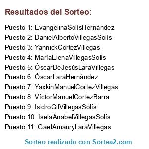 Lista de participantes: EvangelinaSolísHernández, DanielAlbertoVillegasSolís, MaríaElenaVillegasSolís, YaxkinManuelCortezVillegas, YannickCortezVillegas, VíctorManuelCortezBarra, IselaAnabelVillegasSolís, ÓscarDeJesúsLaraVillegas, GaelAmauryLaraVillegas, ÓscarLaraHernández, IsidroGilVillegasSolís.