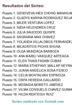 Lista de participantes: AMRIA PAQUITA RENJIFO SALDANA, CYNTHIA MISHELL TORREZ LOPEZ, DAYCE BARDALES LOPEZ, VASQUEZ GRANDEZ ELITA, GEYDI MONTENEGRO JARA, BLANCA FLORES MARLO}, JAMES BECERRA DIAZ, EDELMIRA MONTENEGRO GONZALES, ELITA ELVIRA VASQUEZ GRANDEZ, ELSY LEON MONTENEGRO, ERLITA MARILU CARRASCO FERNANDEZ, JHOYSI LOPEZ ASPAJO, LUCILA OLORTEGUI VARGAS, LUZ MERY HERNANDEZ ROJAS, MARY CRUZ VARGAS RIOS, MERCEDES VELA DEL CASTILLO, NATTALIE RODRIGUEZ, NICOLE ALEXANDRA DEL CARPIO RODRIGUEZ, OMIN PAREDES DEL CASTILLO, YESENIA UGAZ VILLACORTA, YOMAR CANLLA MASLUCRAN, ABRAHAM TAPIA HUAYGUA, CATALINA PINTADO MIJAHUANGA, CHRIS MARICIELO TORRES CELIS, DIANITH CALLAO LOPEZ, EVELIA IVETH RABANAL PENA, FLORMIRA CHILCON CORONEL, GENIRY CRUZADO LLANOS, GLADIS ARELY VILLACORTA RODRIGUEZ, GLENDIS SANDOVAL GOMEZ, GLORIA ANITA PISCO RIOS, ISIDORA ALVARADO TELLO, JORGE LUIS DELGADO DIAZ, JUNITH TAPULLIMA ACOSTA, KEYLA CRUZ LOPEZ, KLEYTON ROBINSON ROMERO MUNDACA, LELIS ODALIS MATTA COLUNCHE, LILIAN JUDITH CUBAS PAJARES, LYLE TOZ VARGAS, MARIA CATALINA BERNILLA RINZA, MARIA SANTOS ALEJANDRIA NUNEZ, MARLENY RODRIGUEZ GALVEZ, MIRIAM DEL RIOSARIO GARCIA JARAMILLO, NOEMI ROJAS VIDARTE, ORFA HEREDIA GALLARDO, REINA JULCA FUENTES, ROSA TEODORA SANCHEZ CASIQUE, ROSE MARY RAMIREZ DIAZ, ROSMERY CAMPOS BUSTAMANTE, ROVER PADILLA CIEZA, SILVIA TARRILLO PEREZ, VILMA CARRERO RAMIREZ, YRIS LILY GUERRA GRANDEZ, ADELIA MIRLA CRUZ CAVERO, BETTY BARDALES CELIS, BETTY DELGADO FUENTES, CELINDA SALAZAR GUEVARA, CLEOTILDE ESPINOZA CHAVARRO, DIMARI GUERRERO CHANLA, EVITH ANGULO DE TUESTA, GISELA VELA VASQUEZ, JESICA AYDE VASQUEZ HERRERA, JHENIFER TUESTA ANGULO, MARIA ADELA CALVAY BERNA, MARILU GAMARRA RUIZ, MARTINA MOZOMBITE VASQUEZ, NANCY CHUQUIZUTA HUANSI, NATALIA ALESSANDRA CARRANZA IRIGOIN, NELVA ARBILDO ECHEVERRE, OLGA MUNDACA BARBOZA, ORLANDO RODRIGUEZ CARRERO, RITA ANDREA LY GARCIA, ROUSER MOLINA HUERTAS, YOISON FLORES CORDOVA, ANA LUCI PEREA RINAVI, DEBORA CHUMBE RIOS, JUANA ANGELICA SOSA FENCO, LUISA AURORA ROJAS CONCHA, MARILU DEL AGUILA MARIN, PATRICIA GOMEZ ALTAMIRANO, ADELAIDA VARGAS CONCHA, AGRIPINA PAREDES GOMEZ, ANA DEL PILA SANTAYA VASQUEZ, BAUTISTA NILSON ROJAS, BERTHA GLADYS REATEGUI COTRINA, CARLOS RAUL GALLEGOS JIMENEZ, DALILA CABRERA FERNANDEZ, DEYVIT JOHAO SANCHEZ IBERICO, DIANA SMITH DIAZ HURTADO, DILMA ALVARADO PEREZ, ROSA GISSELA MERA CASAS, EDVER CUIPAL VENTURA, ELIZABETH ROXANA DAVILA RODAS, ESTHER VASQUEZ VEGA, EVELYN SABRINA BUSTAMANTE CESPEDES, FELICITA CHUQUICUSMA CARISAN, GENOVEVA INES CHONG MANIHUARI, GLORIA MARTHA BRAVO GONZALES DE CRUZ, GLORIA MILAGROS OCAMPO GUERRA, JHOANA SANCHEZ SABOYA, JOSE FERNANDEZ AREVALO, LLANIRA JINETH TAPULLIMA COTRINA, LUZ TABITA CRUZ HUAMAN, LUZDINA MONDRAGON FERNANDEZ, MARIA CONSUELO LOZADA QUISPE, MARIA DEL CARMEN DELGADO DELGADO, MARIA PETRONILA MUNDACA BARBOZA, MARLENE FASABI DE FALEN, MAYRA MIRELLY DEL AGUILA PENA, MIGUELINA LEONARDO LOPEZ, MILAGRITOS PICHIS SHUNA, MONICA JIMENEZ AYAY, NELI REAP HUAMAN, NELITH CAHUAZA CHUJUTALLI, NIDIA HELENDRES CRUZ, NILDA AYAY VILCA, NOELITA CARRAZCO LLANO, ROXANI MALIMBA PACHAMORA, SALOMON DIAZ BUSTAMANTE, SOILA ROSA CHOCON CERCADO, TERESA IDROGO DIAZ, ALICIA MUNOZ DELGADO, ANA MARIA CELIZ FEIJOO, BETSI PETRONILA PINEDO RODRIGUEZ, CLARIVEL RAMIREZ ROMAN, DALILA CHUQUIBALA TUNJAR, DIANA MARGARY CASIQUE, EDITH MARLENE CARO MELENDEZ, ELVIRA HUAMAN LIZANA, ERIK DOMINGO MONTENEGRO CHAVEZ, GENITH MECEDO TEJADA, GILBERTO CRUZ GONZALEZ, GLADYS FLORES VENTURA, MONTENEGRO CHAVEZ ERICK, GREGORIA ISABEL MEDINA ESPINOZA, HILDA REATEGUI RUIZ, HORTENCIA ROJAS GUERRA, JENNIE GIOCONDA ARAUJO BALCAZAR, JENNIFER PALMIRA SEGURA FARFAN, JOANY DEL PILAR DIAZ ZUBIATE, LITA RAMIREZ VASQUEZ, LUZ AMELIA CRUZ REGALADO, MARIA APOLONIA TORRES MEDINA, MARIA ESTHER GARCIA NUNEZ, MARIA STHEFANY MALLAP NEYRA, MARIANELLA SALAZAR GONZALES, MARLENY CANCINO RIVERA, MARTITHA RENGIFO SAAVEDRA, NANCY JHOANA VALLES VASQUEZ, OLIVIA ARACELI AREVALO GUEVARA, ROCIO RUIZ CHUMBE, ROSANNA DE JESUS ASPAJO SOLSOL, TERESA DE JESUS CAMACHO BORBOR, WILSON FUSTAMANTE DIAZ, ZORAIDA VALLES DE CHINGUEL, BANY LUZ QUISPE BURGA, EDWINSON HEREDIA DELGADO, ELVINA DELGADO FERNANDEZ, GLADYS KARINA RODRIGUEZ ROJAS, JOSE LUIS ESTELA LOPEZ, JOSELYN TATIANA MOZOMBITE SILVA, JULEYSI VELA IZQUIERDO, JULIA ROJAS PEREZ, KARIN SANTILLAN ROJAS, LEYDI DIANA ESTELA LOPEZ, LIZBETH ROMERO VASQUEZ, LUZ JAZMIN BURGA GOICOCHEA, MARIA AMELIA PAIMA FLORES, PATRICIA BAZAN SANCHEZ, RENI CHUMBE ARELLANO, RUTH BURGA GOICOCHEA, RUTH ROXANA OJEDA ABURTO, YORSI HELEN GONZALES MONTENEGRO, ARELY TUESTA ANGULO, CELIA MONTALVAN ESPINOZA, ELVA TUESTA CASIQUE DE MEGO, FLOR ANELI FERNANDEZ FERNANDEZ, JESUS CORDOVA GARCIA, JHERLIN ROJAS MONTENEGRO, MATILDE GUERRERO JIMENEZ, MARIA MEREBRIN RIOJA GOYCOCHEA, ERIKA FLORES VELASQUEZ, GLADYS CHACON DEL AGUILA, GRACIELA JUAPE PEREZ, ISABEL TUESTA ROJAS, JESSICA VASQUEZ SANCHEZ, JHENSY HANS CARDENAS CELIZ, JOHAN ABNER TORRES MORI, JOSE ORIEL VASQUEZ BUSTAMANTE, JULIA AURORA SANDOVAL TULUMBA, KATHIUSKA KIRAKU LOPEZ FLORES, KEYLITA SILFELITA PEREZ LOPEZ, KHARINA FLORES VELASQUEZ, LIA EDITH PENA LOPEZ, LUISA MICAELA MIRANDA VALLES, LUZ MERLY CORONADO COPIA, LUZVILDA FERNANDEZ GUEVARA, MARLITH CELIS CHAVEZ, MIRTHA JABAD CARDENAS, NORA MARITA GUEVARA RAMIREZ, ORFELINA YDROGO RUIZ, ROCIO DEL CARMEN MORENO RIVERA, SANDRA HABIGAIL CARRERO OBLITAS, SHIRLEY ELIZABETH ZELADA ABANTO, SILVIA CELIZ DE CARDENAS, TEUDOCIA MONTENEGRO SANCHEZ, YEIMI YESENIA CORONEL RODRIGUEZ, AMANCIO DIAZ CULQUI, ANADELY GUEVARA CABRERA, ANALI MUNOZ DIAZ, BELDAD PORTOCARRERO PADILLA, BERCELIA DIAZ PEDRAZA, CANDY MARILUZ GARCIA VENTURA, CARMEN RUTH MARIN HUAMAN, CLAUDIA NATALY CASTRO CONDOR, CONSUELO RAFAEL DE ORTIZ, DARWIN JOSE LLATAS DELGADO, DELIA FLOR DELGADO TELLO, EDER MARCIAL BONILLA ALMESTAR, ELENA VERA CIGUENAS, ELIZABETH ALMESTAR FLORES, ELIZABETH PINTADO CORDOVA, ENCARNACION PANDURO SANDOVAL, ESMERIA MUNDACA ESTELA, ESTEFANY TAUMA CORRALES, ESTER VASQUEZ CALDERON, EUFELIA VAZQUES MONTEZA, EVITA MARIA BECE
