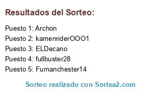 Lista de participantes: alcatrazzzz, Alixia, animelord, Archon, brianext, claros23, CrAzY112, Darkmatt, Darkrafox, dhamc, Dodosapiens, Dracooban, EduardFenix, EGODRACO, ELDecano, FaVuCo, fullbuster28, Fumanchester14, gerardo lider, Harno, Jalid, Jazmin, K43L, KamenRiderDouble, kamenriderOOO1, Kastor Troy, KENTRAL, Liveorundead, Madafako, MagicLiks, MagicMauri, mata chanchos, monderx, Mugetsu, NixJuCaQuiroz, NotFantogram, Opetoro, pabbrinnegan, PEPELOCO TEAM, predator300, Proometeous, QSWA, Rafelas, Raganaro, rockabado, SANTKING1, Seryel, Siegfriedd, Skulld, sweettooth, TODYÑO, Tyrenidar, XxClozurexX, yuguero.