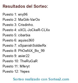 Lista de participantes: iFaMoous-, adria13, adrian100one_ZOMBIES, adriangabu, aioaioaa14, AiToRPuZoL, aki-el-k-no-fuma, albertot2, alesito90, Alexkamimkaze, Alvaaroo16, alvaricoo, andueza, antonionini, aquiso360., aquiso360, ArNoir., ArNoir, asier22, balonmanobalear, Bope72_VLC, bugma, Cadel_dkv, calanatar, callofdutyblackopszombis, Camarc95, CarlosY2J, cborja, ccarlees, cesarvillalcaste, chals_95, chiro76, Chito_esp, cibarbia, cokelas, cris-modern-2, Crisdinho., Crisdinho, CristianPPB, DanWork., DanWork, Datrebil, Deidara_Uchiha, DeniH, divy_A17, dj_capa_company, DobleSe, Double0PS, dranni, ed_400, ElAdrii, ElPercebe, elsnake88, enJonKen-490, eNNz0., eNNz0, enric1998, eny96., eny96, erdavi, esmilo_12, Euleon, Exoder, Extingido, fernan, FGiner25, franbasket, gadimaro, Gato_OGT, GDH6200, GONZY-FC, Gornes_B, heXxtremeJosh, Hongoloko, iFoukS, iJorgZz, iKeeYeR_MoNsTeR, iLuX3D, iMpAcT_FeAr, iooo29, iSeok, isidoro, ivan11rap, iZuck, j4_pes, JahLovE_1, jaime-viso, jcbm1995, JOHN-RAMBO_242, Jokinzazpi, jorgesmok, JORNADA16, juankay5, Karpeh, Karpeh., Kerochan, kiamasu, KiLLeR_MWS, Killer-CanariO, KkomunistHD, LaPene, lordkiller12, LosT-rivaaS, luffy96, lusko10, maalre, MaGiik-VarOo, maquiner la tra-21, Marco, Marcos_Stark, markillosbm69, mataceros, mauriicsm17, Mesuz_Sniper, Mferyt, miqui__, misujin_o, mort1984, Mossy98, mp367887-SergiO, n182_182, nachi187, Nameless, Nasbul, NeloX, nenneh8, nenneh8., nexete23, noohega, NORHAM13, Opforen, opoderoso, oscar_rcob., oscar_rcob, oscarmj11., oscarmj11, Ovetense18, P-A-I-N-9618, pablillo_zgz, Pablitouch, Pablix5, pascu_1996, Pastorret, pelicano_02, PhOeNiX_Bo_99, Plamen_1996, PoKEnu, propanitoo, PUPOXX, Qu!cK_ScOpEzZ, RadiiNiL, Ragna6765, Râiddenz., Râiddenz, Ramiss, raulpb00, ravager3, Rinoceronte, rkpower, Rompe-techos, ruk0s, Ruterford, SAMUELRM, sanchoalag96, SaNtAkO11, sergio-em17sas, Shail95, SiCoTrONiC, siffty, Slar_9, Slar_9., SleepingCuriosity, Snip_Sosky, soapofnapalm, solrak69, Spacer, Spacer., stygma, Supermantxitos, tamborin, TehFecky, TehVolum3, tepo1996, tha_crow_2010, TheRuGaR, tigre-naruto, TKiz69, tuso., tuso, tuyif5, Varu_47, vhl8, vicen_7-95, villaka1, willi6970, X-Darkdragon-X., X-Darkdragon-X, xAntonioGv, xarlitos105, xBeTox_96, xCrisT-_, xCrisT-_., xDeeiv11d, xFriGhtzZ, xinxe_, xiscocod7, xlRogeRlx., xlRogeRlx, xNeRoO_, xRaser, xSpanishSoldieRx, xWiidow-, Xx_MeRoT_xX, xX_SnIp3r_AtM_Xx (ps3), xXCL-JoCkeR-CLXx, XxRubnxX, xXSUAD-MARCXx, YainmaX, YAS292, Yepes, Yillen, zac8, zDuReeX, ZoHaaN.