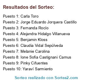 Lista de participantes: Manola Palomera Echeverría, Aretousa Giannakou, Gema Hernández Correa, Judas Iscariote, Agüita Da, Alberto Antonio Otárola Martínez, Alberto Versace Castillo, Aldo Chipani, Ale Anfruns, Ale Viacava, Alejandra Alarcon Alcantar, Alejandra Cares C., Alejandra Faúndez, Alejandra Hidalgo Villanueva, Alejandra Medina Silva, Alejandra Olave, Alejandra Palma Vargas, Alejandro Benítez Sepúlveda, Alejandro Caballero, Alejandro Concha, Alejandro Díaz Fuentes, Alejandro Hernandez, Alejandro Martínez, Alejandro Reyes Malgüe, Alejandro Venegas, Alex Araya, Alex Olivares, Alexandra Cornejo, Alexis Carvajal, Alexis Flores Sepulveda, Alexis Ibarra, Aline Apencoral, Aline Méndez Muñoz, Alma Adamek, Almeej Viera, Alvaro Gonzalo Flores Guiñez, Alvaro Henriquez, Amaranta Alejandra Talamilla Varela, Amaranta Buendía, Amaranta Navarrete, Ana Calero San Martin, Ana Carolina Merino Vargas, Ana Katerinna Mella Ceron, Ana M. Muñoz, Ana María Leiva Blanco, Ana María Olivares Rivas, Ana Van Der Veen, Analía Mariela Álvarez Seguel, AnaMaría Troncoso-Sandoval, Anastasia Vargas, Andrea Castro, Andrea Esperguel Sepúlveda, Andrea Gavilan, Andrea Gutiérrez Vásquez, Andrea Isabel Flores, Andrea McFly, Andrea Melgarejo, Andrea Paz Sepúlveda Zelaya, Andrea Ramirez, Andrea Sebastiani, Andrea Too El Rato, Andrea Valdeavellano, Andrea Valdés Canepa, Andrés Arias Silva, Andres E Gonzalez, Andres Guerra, Andres Mella Couro, Andrés Merino, Andres Quijada Venegas, Andreyna Luna, Ange Verdugo Luna, Angela Tobar, Angelica Reyes Jorquera, Angelicuzza Pedalea, Angelo Adasme, Angelo Barria, Anggela Espinoza, Ani Del Mar, Aniela Wewer, Anís Estrellado, Anita Bravo Vergara, AniTa Gonzalez Ayala, Anna Pablina, Antonia Morales Vera, Antonieta Aguayo Ramirez, Antonio Bobadilla, Antonio Poblete, Antoo Ayala Becerra, Anyela Sánchez, Arabrab Aerdna, Arali Pole, Aranka Scherping, Ariel Martínez, Ariela Muñoz Arias, Arnaldo Andrade, Arturo Ramírez Panoramas Gratis, Aspasia Valeska Aspée Santelices, Ayleen Belén López Gallardo, Aymara GRr R, Azul Lilith's, Bárbara Andrea Luna Villagra, Barbara Araya, Bárbara Catalina Loreto, Barbara Chavez Gottlieb, Bárbara Javiera, Bárbara Miranda León, Barbara Reyes, Bárbara Scarleth P, Barby Nicole Reffer Jofre, Beatriz Carolina D, Belén Blaise, Belén Perez Gallardo, Belen Rojas Rojas, Benjamin Kloss, Benjamin Ortiz-Ipinza, Berenice Toloza Anahata, Bernardita Andrea Concha Penroz, Bernita Parra, Bianca Geroldi, Biki Páez, Bolivar Contreras Simon, Boris Hb, Braulio Keni Rojo Opazo, Brisalia Fernandez Soto, Briz Kathy, Buffy Anne, Cafuzo Pernambuco, Cam Cat, Cami Ramírez, Camila Aguirre Beltrán, Camila Alejandra Ferrada Castillo, Camila Andrea, Camila Andrea Boisier, Camila Andrea Gómez Antichevich, Camila Castillo Véliz, Camila Espinoza Hernandez, Camila Figueroa Isasi, Camila Figueroa Lasch, Camila Gonzalez Meneses, Camila J. Martínez, Camila Julia Soto Carmona, Camila Macarena Vergara Vilchez, Camila Nadie, Camila Pimentel, Camila Santibáñez, Camila Tobar, Camila Vivallo Valdés, Camille Cuevas, Cape Naneenetuu Labarca, Carito Sánchez Rivas, Carla Canales Miranda, Carla Carrera Galdames, Carla Cea, Carla Francesca Urzua, Carla Garrido, Carla Molina Figueroa, Carla Olivares, Carla Paz, Carla Renata, Carla Toro, Carla Vilches Ñancupil, Carlo-André Castro, Carlos A. Ormeño, Carlos Aguilera, Carlos E Adasme, Carlos Feisal Eysatt, Carlota Espina, Carmen Andrea Mantilla, Carmen Gloria Caceres, Carmen Pueyes, Carmen Rodríguez Soto, Caro Pardo, Carol Lizama Otarola, Carol Valderrama, Carol Vega, Carola Barrera Hennings, Carola Rauld, Carola Salas, Caroli Gomez-Rojas, Carolina Aravena Troncoso, Carolina Araya Romo, Carolina C Cea, Carolina Caselli Marchant, Carolina Castro Zamorano, Carolina Elizabeth Melgarejo Caamaño, Carolina Ferrada Contreras, Carolina Gajardo, Carolina Gonzalez Venegas, Carolina Gutiérrez, Carolina Jeldres Oreña, Carolina Mad, Carolina Oliva, Carolina Ortega Pérez, Carolina Reyes, Carolina Riveros Sepulveda, Carolina Soto Contreras, Carolina Zamorano, Caroline Morales Martínez, Caroll Pedraza, Carrie Pérez Aqueveque, Cata Coldeira Bobadilla, Cata Collinao Mutis, Cata Cronopio Cruenta, Cata Lina Buscapiés, Cata Luna, Cata Marchas, Cata Metztli, Cata Miau, Catalina Alarcón Reyes, Catalina Allende Becerra, Catalina Fuentes Vasquez, Catalina Jofre, Catalina Maria, Catalina Órdenes, Catalina Paz Infante Ferrari, Catalina Pinilla, Catalina Pino Carril, Catalina Reina, Catalina Solé, Catalina Tello, Catalina Venegas, Cathy Tornel, Catu Andrea, Cavada Veronica, Ceci Orange, Cecilia Astorga, Cecilia Carrasco, Cecilia Diaz H, Cecilia Riffo, Cecilia Urbina, Cecilia Wiehoff, Celeste Cortes Provoste, Cesar Quiroz, Cesar Rodriguez Urzua, César Vallejos Leal, Cheburashka Al, Cheri Zuñiga Vasquez, Chika Do Mel, Chloé Billebault, Chovi Kjsksjsksjs, Christian Contreras Castro, Clara Luz Urrea Parra, Clau DíAz, Clau Dita, Clau Francisco, Claudia Canales Galaz, Claudia Catalina Ljubetic García, Claudia Catalina M, Claudia Celis, Claudia Daniela, Claudia Herrera, Claudia Ignacia, Claudia Leòn Malgue, Claudia Martinez, Claudia Mazuela, Claudia Montecinos, Claudia Tobar Ramirez, Claudia Vidal Sepúlveda, Claudio Andres Saavedra Gonzalez, Claudio Calabrán Muñoz, Claudio Ojeda Gallardo, Claudio Puebla Rojas, Claudio Ramírez Cornejo, Claudio Skadavespeor Q, Claudio Troncoso, Claudita Clau Vivar, Claudita Mishu Garrido, Coca Catepillán, Cocodrilo Ciclista, Colomba Figueroa, Colorina Solar, Concejal Macarena Zamorano, Conny Andrea Manson, Constanza Benvenuti Velásquez, Constanza Beytía, Constanza Catalina, Constanza Catalina Jaramillo López, Constanza Gacitúa, Constanza Guzmán, Constanza Pậz, Constanza Torres Ramírez, Constanza Valderrama, Consuelo Arévalo, Consuelo Estadella, Consuelo Mora Silva, Consuelo Orrego R., Coté Escanilla, Criss Jagdzauber, Cristián Andrés Cataldo, Cristian Bustamante Muñoz, Cristian Bu