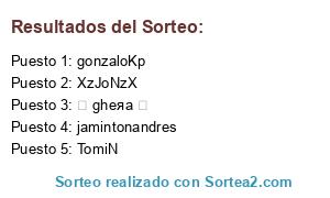 Lista de participantes: TomiN, XzJoNzX, gonzaloKp(3 participaciones), ϟ gheяa ϟ(3 participaciones), jamintonandres(3 participaciones).