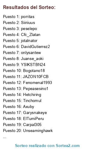 Lista de participantes: chevy_ _1992, Mariosofrv, fricknopa_fcc, camilo0512, Nacional110, X_Juankmfc_X, laujan1218, Garysnakeye, Bogotano18, DavidGutierrez2, Tinchomul, Lgrand10s, Carpal305, nelsinho23, maxxi_27, Juanse_aoki, Pepeasesino1, ElTumiPeru, stikjorJC17, Valcrist, PERUANOFORCE10, davidal1014, Botyz10, Fenomenal1993, onlysantew, Colombiannicko, Mateo_CFI, melendez_marco, Ricawoody14, FF-GERMAN, Jovanny1981, snake-075, snake-0751, Nathan_0223, peselepo, Hetchiring, DECANO_TORRES, Tu-muert3, jotalnator, Cfc_Zlatan, SergioAlbi-Rojo, matiasmarin2014, LM_Mafla_I9I, ironmaneslaond, cristhian_fistks, JAZON10FCB, Leodiaz_27, Axuby, Torettao-CFI, HND _ - Marcos - _ HND, o11ceCaldas, Lcharry79, LeanDami05, The_keane29, Ramagol5, torettoidag, XxfAlcoxX_, JavierOp915, flosanlopez17, adonko, Juanksh1133, Siiriiuus, joZeto_90, Cajf, JulianMB1986, Polaniar, CamiloDiaz6, YSIKSTBN24, JMpIx, Naluffy-D, JR-Palazzo, WillMolinag, Lokombia_27, diegoalvarez12, Andresmesa11, Unseaminghawk, Pablo_CJA, Yalexito7, Fer-Villa105, porritas.