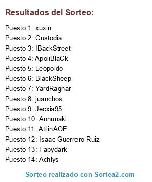 Lista de participantes: ApoliBlaCk(2), AtilinAOE(4), Isaac Guerrero Ruiz(3), xuxin(10), Achlys(1), Leopoldo(3), IBackStreet(10), YardRagnar(16), Fabydark(2), juanchos(7), BlackSheep(13), Jecxia95(12), Custodia(5), Annunaki(5).