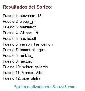 Lista de participantes: stevaaan_15, pipe_alpha, elpapi_jm, hektor_gallardo, mirkito_, nector8, tomas_villegas-, tonhinhoz, Manxel_Albo, nachoxs8, Ginoox_19, yeyson_the_demon.