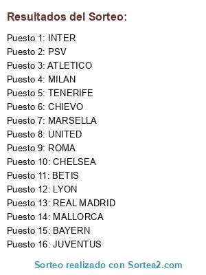 Lista de participantes: BETIS, PSV, REAL MADRID, CHIEVO, MARSELLA, LYON, MALLORCA, MILAN, TENERIFE, CHELSEA, UNITED, JUVENTUS, ATLETICO, INTER, ROMA, BAYERN.