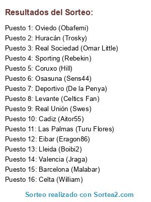 Lista de participantes: Sporting (Rebekin), Cadiz (Aitor55), Lleida (Boibi2), Eibar (Eragon86), Levante (Celtics Fan), Coruxo (Hill), Huracán (Trosky), Las Palmas (Turu Flores), Osasuna (Sens44), Real Unión (Swes), Barcelona (Malabar), Real Sociedad (Omar Little), Celta (William), Valencia (Jraga), Oviedo (Obafemi), Deportivo (De la Penya).