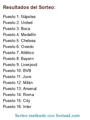 Lista de participantes: Medellín, Chelsea, Atlético, Juve, Milán, Roma, United, City, Arsenal, BVB, Boca, Nápoles, Bayern, Liverpool, Inter, Oviedo.