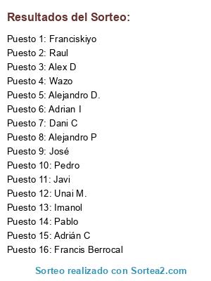Lista de participantes: Imanol, Wazo, Dani C, Francis Berrocal, Pablo, Raul, Alejandro P, Pedro, José, Alex D, Adrian I, Javi, Unai M., Adrián C, Alejandro D., Franciskiyo.