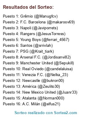 Lista de participantes: Atalanta (@Norman000), Santos (@srrivlah), Manchester United (@Sepukill), F.C. Barcelona (@makaroov69), Grêmio (@Manugfcv), A.C. Milán (@elfus21), New Mexico United (@Juanr33), PSG (@Krait_tiark), Newcastle (@bukron00), Real Oviedo (@candelaluisa), Rangers (@JesusTorress), Venezia F.C. (@Nelka_23), Young Boys (@ferrari_4567), Napoli (@Javiporrets), Arsenal F.C. (@Jordisanvi82), América (@Zeulito30).