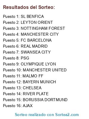Lista de participantes: FC BARCELONA, MANCHESTER CITY, MANCHESTER UNITED, REAL MADRID, PSG, OLYMPIQUE LYON, BAYERN MUNICH, BORUSSIA DORTMUND, AJAX, SL BENFICA, RIVER PLATE, CHELSEA, NOTTINGHAM FOREST, LEYTON ORIENT, MALMO FF, SWANSEA CITY.