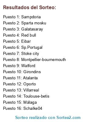 Lista de participantes: Atalanta, Villarreal, Watford, Stoke city, Málaga, Eibar, Schalke04, Red bull, Girondins, Toulouse-betis, Sparta mosku, Sp.Portugal, Oporto, Galatasaray, Sampdoria, Montpellier-bournemouth.