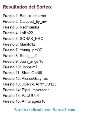 Lista de participantes: Redmamba, AntGragera10, AlonsoGrayFox, PaUUU24, Lolito22, Juan_angel10, Young_pro97, Pipol-Imperador, JONY-CAPIYOU123, Jorgelm7, Clapped_by_mv, Barlica_churros, Marlito12, Soto___11, SORAK_PRO, SharkGar06.