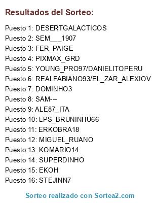 Lista de participantes: LPS_BRUNINHU66, SEM___1907, ALE87_ITA, STEJINN7, ERKOBRA18, SAM---, SUPERDINHO, PIXMAX_GRD, EKOH, DOMINHO3, MIGUEL_RUANO, YOUNG_PRO97/DANIELITOPERU, REALFABIANO93/EL_ZAR_ALEXIOV, DESERTGALACTICOS, FER_PAIGE, KOMARIO14.