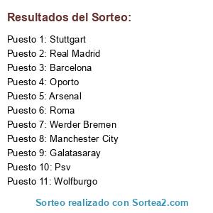 Lista de participantes: Werder Bremen, Psv, Stuttgart, Oporto, Barcelona, Real Madrid, Arsenal, Roma, Wolfburgo, Manchester City, Galatasaray.