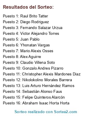 Lista de participantes: Nikolokolino Morales Barrera, Abraham Isaac Horta Horta, Luis Arturo Hernàndez Ramos, Gonzalo Andres Pizarro, Juan Pablo, Victor Alejandro Torres, Yhonatan Vargas, Christopher Alexis Mardones Diaz, Felipe Quinteros Alarcón, Diego Rodriguez, Sebastián Alonso Faus, Fernando Salazar Urzua, Mario Alexis Osses, Alex Aguirre, Raul Brito Tatter, Claudio Villena Soto.