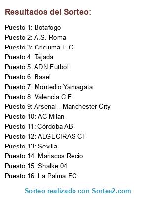 Lista de participantes: sl Benfica, Las Urracas Black, Málaga AB, Inter De Monterrey, Tiki Taka, Real VillaVardy, Schalke 04, ADN Futbol, Atlético de Madrid - EscuelaVieja, Chievo Verona, Xabioneta, P S G yes come on, SEV7LLA FC, Pinturas Barcelo, Bayern de Múnich, Córdoba AB.