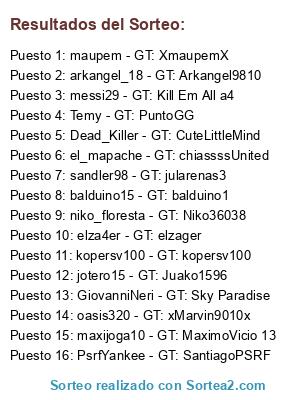 Lista de participantes: kopersv100 - GT: kopersv100, niko_floresta - GT: Niko36038, maupem - GT: XmaupemX, messi29 - GT: Kill Em All a4, PsrfYankee - GT: SantiagoPSRF, Dead_Killer - GT: CuteLittleMind, jotero15 - GT: Juako1596, sandler98 - GT: jularenas3, balduino15 - GT: balduino1, elza4er - GT: elzager, arkangel_18 - GT: Arkangel9810, GiovanniNeri - GT: Sky Paradise, el_mapache - GT: chiassssUnited, Temy - GT: PuntoGG, maxijoga10 - GT: MaximoVicio 13, oasis320 - GT: xMarvin9010x.