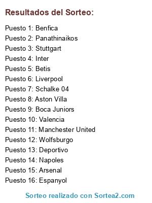 Lista de participantes: Aston Villa, Manchester United, Wolfsburgo, Panathinaikos, Boca Juniors, Inter, Espanyol, Liverpool, Valencia, Napoles, Arsenal, Benfica, Schalke 04, Stuttgart, Betis, Deportivo.
