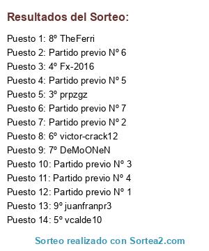 Lista de participantes: 3º prpzgz, 4º Fx-2016, 5º vcalde10, 6º victor-crack12, 7º DeMoONeN, 8º TheFerri, 9º juanfranpr3, Partido previo Nº 1, Partido previo Nº 2, Partido previo Nº 3, Partido previo Nº 4, Partido previo Nº 5, Partido previo Nº 6, Partido previo Nº 7.