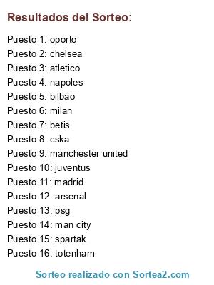 Lista de participantes: cska, arsenal, atletico, manchester united, man city, betis, chelsea, napoles, madrid, juventus, milan, spartak, oporto, totenham, psg, bilbao.