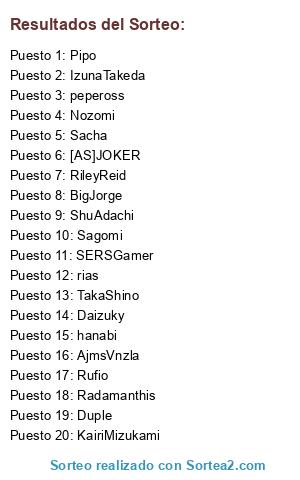 Lista de participantes: Sagomi(3), Daizuky(4), KairiMizukami(3), AjmsVnzla(4), pepeross(5), hanabi(6), Radamanthis(5), Duple(3), SERSGamer(8), RileyReid(9), Rufio(4), BigJorge(3), TakaShino(2), Nozomi(7), IzunaTakeda(7), Pipo(5), [AS]JOKER(2), rias(2), ShuAdachi(4), Sacha(6).
