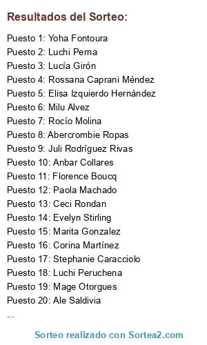 Lista de participantes: Mariana OG, Silvia Garay, Ada Vargas, Graciela Carchietti, Ivana Tejera, Laura Etxaide, Romina Giselle, Cielo Farías, Veronica Jacquet, Ivana García, Pamela Topyla, Jesica Heffner, Caro MP, Daiana Guillen, Silvia Carchietti, Caro Martelletti, Mary Lourado, Malen Ro, MFlor Sarik, Anabella Ledesma, Claudia Bonura, Stella Velasco, Hilda Díaz, Flor Pereyra, Alejandra Minutolo, Maria Paz Rodríguez, Maria Marta Vieytes, Grisel Martínez, Caro Jimenez, Cintia Puig, Veronica Bevilacqua, Gabriela Fernandez Menendez, Karina Gabriela, Tatiana Soares, Merce Fernández, Nancy Martínez, Nacha Frere.