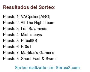 Lista de participantes: Shoot Fast & Sweet, VACpolice[ARG], Los Salamines, Fr0sT, Martitas's Gamer's, PitbullSS, Misfits boys, All The Night Team.