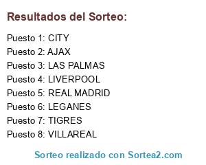 Lista de participantes: LEGANES, LAS PALMAS, LIVERPOOL, AJAX, VILLAREAL, TIGRES, CITY, REAL MADRID.