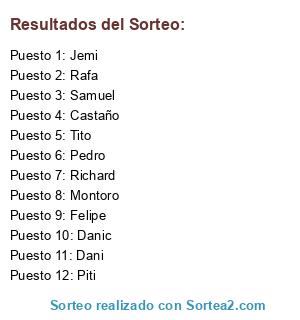 Lista de participantes: Samuel, Felipe, Montoro, Castaño, Pedro, Dani, Danic, Tito, Piti, Richard, Rafa, Jemi.