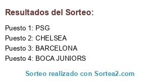 Lista de participantes: BOCA JUNIORS, BARCELONA, CHELSEA, PSG.