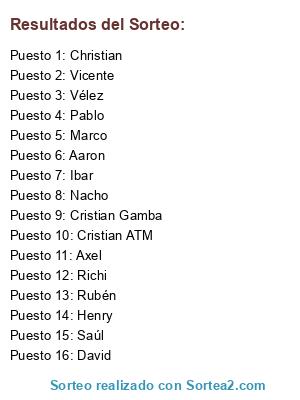 Lista de participantes: Aaron, Axel, Cristian Gamba, Cristian ATM, Christian, David, Henry, Ibar, Marco, Nacho, Pablo, Richi, Rubén, Saúl, Vélez, Vicente.