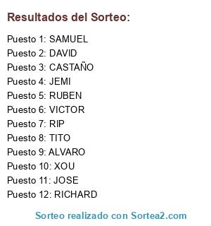 Lista de participantes: SAMUEL, JEMI, CASTAÑO, DAVID, JOSE, RICHARD, TITO, RIP, RUBEN, VICTOR, XOU, ALVARO.