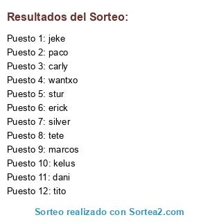 Lista de participantes: tete, tito, marcos, silver, stur, kelus, jeke, dani, wantxo, erick, paco, carly.