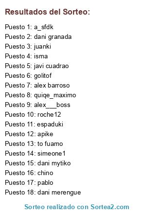 Lista de participantes: apike, alex barroso, chino, dani mytiko, to fuamo, espaduki, golitof, dani granada, javi cuadrao, pablo, dani merengue, alex___boss, quiqe_maximo, roche12, simeone1, a_sfdk, juanki, isma.