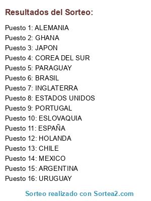 Lista de participantes: URUGUAY, MEXICO, ARGENTINA, COREA DEL SUR, ESTADOS UNIDOS, INGLATERRA, ALEMANIA, GHANA, HOLANDA, JAPON, PARAGUAY, ESLOVAQUIA, BRASIL, PORTUGAL, ESPAÑA, CHILE.