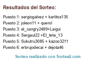 Lista de participantes: sergiogalvez + karlitos135, el_cangry2489+Laigui, erbrujodecai + dejota46, joleon11 + querol, Sergaul22 +El_tete_13, Sukutru3085 + kazoo3211.