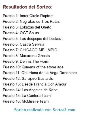 Lista de participantes: Negratas de Tres Patas, Los despojos del Lockout, Inner Circle Raptors, Los Angeles de Kobe, Lokazas del Gheto, Sarajevo Bastards, Churriana de La Vega Danoninos, McMissile Team, CHICAGO MELIMPIO, OGT Spurs, Desde Francia Con Amour, Dennis The worm, Castra Servilia, Macarena Ghosts, La Cantera Team, Queens of the stone age.