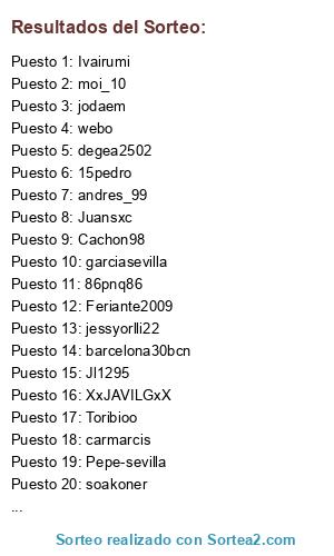 Lista de participantes: Cachon98, Admin, andres_99, barcelona30bcn, 86pnq86, jessyorlli22, Fcosillas, catadani1995, Furri_ubl, webo, jodaem, Pepe-sevilla, Juansxc, garciasevilla, moi_10, soakoner, Toribioo, Ivairumi, 15pedro, Jl1295, degea2502, carmarcis, XxJAVILGxX, Feriante2009.