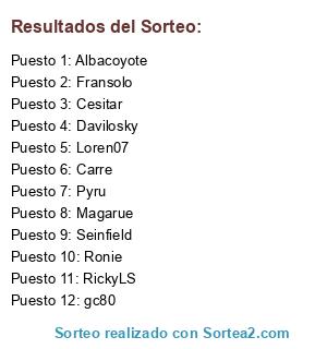 Lista de participantes: Ronie, Pyru, Albacoyote, Seinfield, Davilosky, Magarue, Fransolo, gc80, Cesitar, RickyLS, Carre, Loren07.