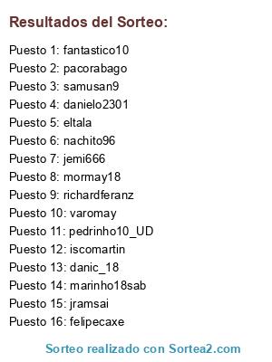 Lista de participantes: samusan9, jemi666, danielo2301, felipecaxe, fantastico10, iscomartin, richardferanz, nachito96, eltala, danic_18, marinho18sab, jramsai, pacorabago, pedrinho10_UD, mormay18, varomay.