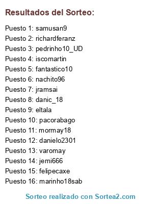 Lista de participantes: samusan9, jemi666, danielo2301, felipecaxe, fantastico10, iscomartin, richardferanz, nachito96, eltala, danic_18, marinho18sab, jramsai, pacorabago, pedrinho10_UD, mormay18, varomay.