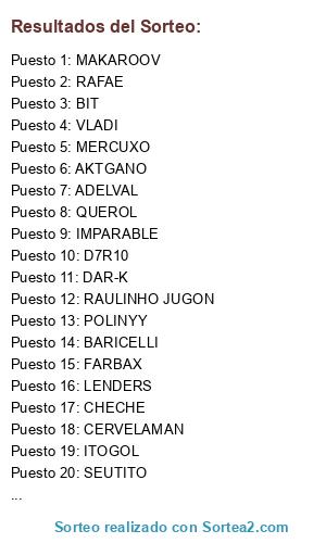 Lista de participantes: CHECHE, LENDERS, ADELVAL, POLINYY, FARBAX, RAULINHO JUGON, LANKI, SULLYBAN, MAKAROOV, BARICELLI, ITOGOL, IMPARABLE, JOSE VALLECAS, D7R10, KERO, AKTGANO, CERVELAMAN, LAYRLIA, SEUTITO, BIT, RAFAE, CALVOTAINAS, QUEROL, VLADI, DAR-K, MERCUXO.
