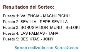 Lista de participantes: VALENCIA - MACHUPICHU, LAS PALMAS - TANA, BESIKTAS - JONY, BORUSIA DORTMUND - BELOKI, SEVILLA - PEPE-SEVILLA.