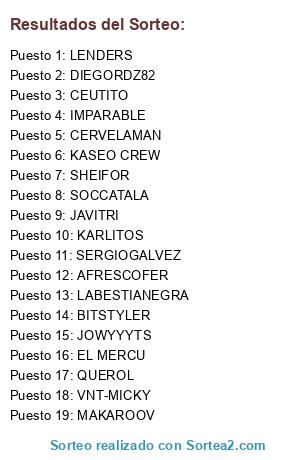 Lista de participantes: AFRESCOFER, BITSTYLER, CERVELAMAN, CEUTITO, DIEGORDZ82, EL MERCU, IMPARABLE, JAVITRI, JOWYYYTS, KARLITOS, KASEO CREW, LABESTIANEGRA, LENDERS, MAKAROOV, QUEROL, SERGIOGALVEZ, SHEIFOR, SOCCATALA, VNT-MICKY.
