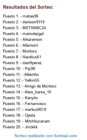 Lista de participantes: - mariodazgal, - markus9519, - NautilusX1, - Ojeda, - Altamont, - dani9perez, - METRABC24, - Fernanvisco, - Albertito, - Kanyito, - Montoro, - Aleis_barsa_10, - Mitchbucanam, - Arkaremion, - Yelkin55, - danison9119, - Jnickkk, - matias95, - Pip3R, - Amigo de Montoro.